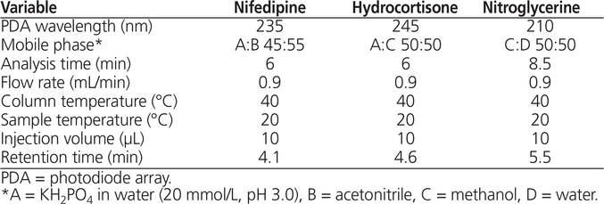 Samples were quantitatively transferred into 1.5-mL centrifuge tubes, and dichloromethane was added (85 mg of test preparation in 900 µL dichloromethane for nifedipine and hydrocortisone samples and in 400 µL dichloromethane for nitroglycerine samples). The tubes were vigorously stirred using a vortex shaker until the ointment was completely solubilized. An aliquot of each solution was then diluted with methanol (100 µL of nifedipine solution with 750 µL of methanol; 100 µL of nitroglycerine solution with 580 µL of methanol; and 20 µL of hydrocortisone solution with 830 µL of methanol) and refrigerated at 5°C for 15 min to precipitate the petrolatum. The supernatant was filtered through a syringe filter (0.45 µm, nylon) and then analyzed by high-performance liquid chromatography (HPLC). Assuming a potency of 100% and a preparation density of 0.9 g/mL, the final concentration of nifedipine, hydrocortisone, or nitroglycerine in the injection samples was 50 µg/mL (calculation example for nifedipine: 0.5% × 85 mg / (85 mg / 900 mg/mL + 0.9 mL) × 0.1 mL / (0.1 mL + 0.75 mL) = 0.050 mg/mL = 50 µg/mL). Each injection was performed in duplicate. Each preparation was independently stored in 3 separate containers, and all containers were tested at all time points. Amber HPLC vials were used for the nifedipine-containing samples.
