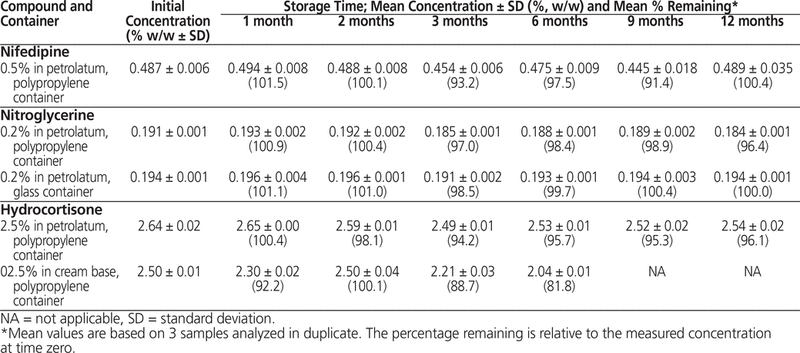 Hydrocortisone 2.5% in petrolatum, nifedipine 0.5% in petrolatum, and nitroglycerine 0.2% in petrolatum are nonaqueous preparations. They remained stable for at least 1 year when stored at 25°C. Previous reports have highlighted the risk of sorption for nitroglycerine stored in plastic containers.15 However, in the current study, the use of glass containers was not critical to the stability of the nitroglycerine preparation. Most likely, the petrolatum itself acts as an excellent chemical and physical stabilizer for nitroglycerine, as nonrelevant quantities were adsorbed or absorbed by the plastic container.