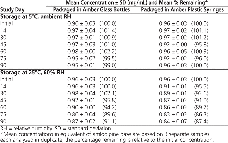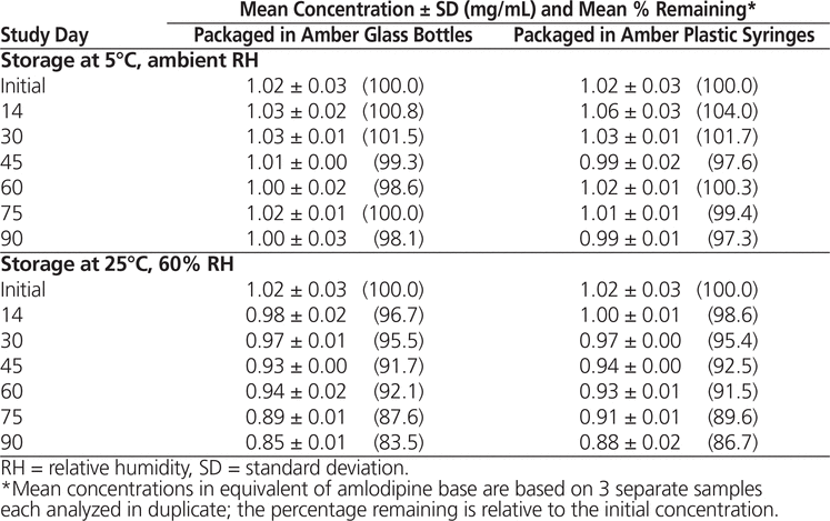 In conclusion, amlodipine besylate suspensions equivalent to 1 mg/mL of amlodipine base in Oral Mix prepared from bulk powder were stable for up to 90 days at 5°C (98.1% remaining in bottles and 97.3% remaining in syringes) and 60 days at 25°C (92.1% remaining in bottles and 91.5% remaining in syringes). Suspensions prepared from tablets were also stable for 90 days at 5°C (99.0% remaining in bottles and 100.0% remaining in syringes), but with storage at 25°C, these suspensions were stable for only 60 days in bottles (94.2% remaining) and 45 days in syringes (91.0% remaining). These results are comparable to the results obtained by Nahata and others5 using other aqueous vehicles.