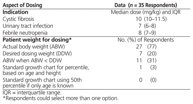 Questions about dose focused on use of the drugs of interest in cystic fibrosis, urinary tract infection, and febrile neutropenia, because the literature review identified these disease states as the ones that have been most studied in pediatric patients. For questions to which respondents could reasonably be expected to have more than one response, respondents were allowed to select all answers that applied to their respective institutions. A free-text box was provided to capture additional responses. None of the questions were mandatory. Respondents were instructed to provide responses referring only to the care of pediatric patients and to exclude any reference to practices for patients in the neonatal intensive care unit. The survey took about 10 min to complete and was open for responses for 1 month; potential participants received a midpoint reminder via e-mail.