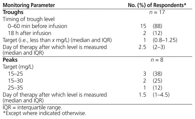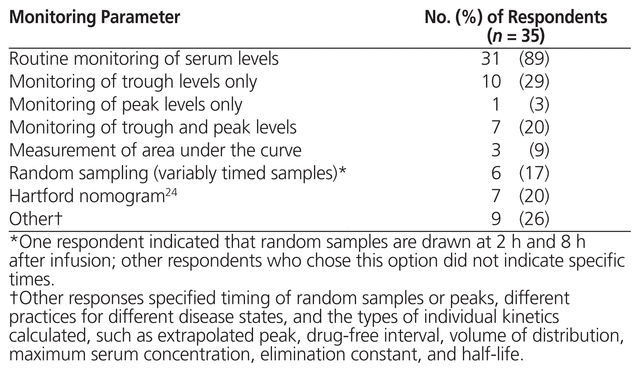 The 35 respondents who reported using high-dose, extended-interval aminoglycosides were asked about monitoring parameters for serum levels and toxicity; 31 (89%) indicated that they routinely monitored serum levels (Table 4). Specific details about peak and trough monitoring parameters are presented in Table 5. The 3 respondents who reported using area under the curve measured the first sample 2 h (n = 1) or 3 h (n = 2) after the start of infusion and the second sample 6 h (n = 3) after the start of infusion, targeting 70–100 mg * h/L (n = 2) or 70–110 mg * h/L (n = 1). These 3 respondents indicated that the area under the curve was measured after 1 day of therapy. With respect to dose adjustments based on monitoring of serum level for all respondents using high-dose, extended-interval aminoglycoside therapy, the responses were varied and included changing the dose or the interval on the basis of individual kinetics or a particular nomogram not specified. The majority of respondents (n = 25) used the same monitoring parameters for gentamicin and tobramycin.