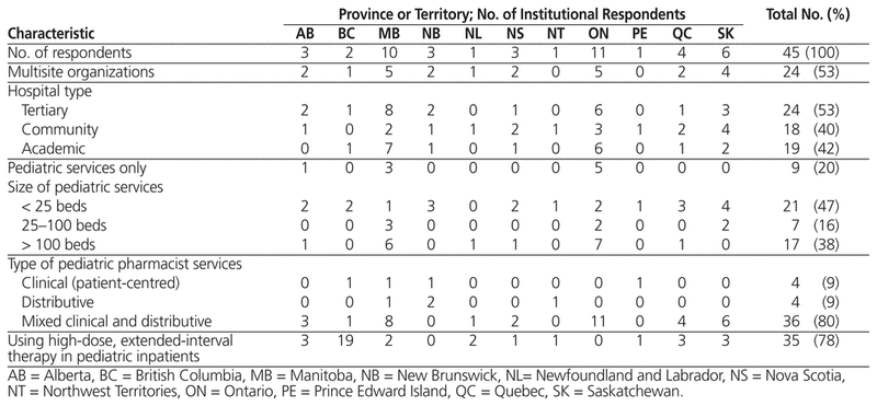 The initial e-mail requesting participation in this survey was sent to pharmacy directors and managers from 104 health regions; 10 of the messages were undeliverable, which left 94 potential participants. A total of 45 pharmacists responded to the survey, for a 48% response rate. The majority of respondents were from Ontario or Manitoba, and just over half represented multisite organizations. There was a diverse representation of hospital types and pediatric services (Table 1).