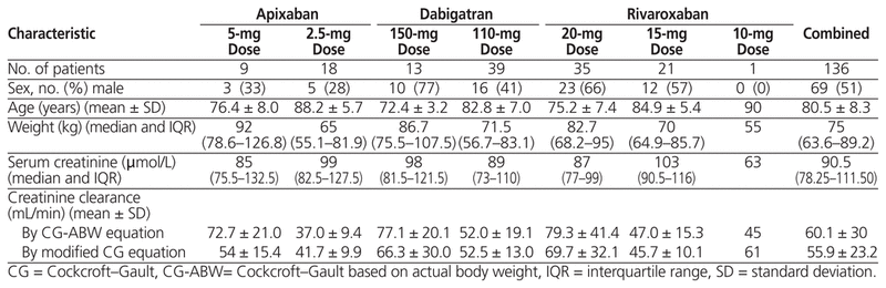 The assessments of discharge doses in relation to recommendations in the Canadian product monographs are summarized in Table 2. Overall, on the basis of the CG-ABW equation, the prescribed dose upon discharge was appropriate for 102 (75%) of the patients. For the 34 (25%) patients whose prescribed discharge dose was inappropriate on the basis of the CG-ABW equation, the prescribed dose was subtherapeutic for 20 (15% of the entire sample) and supratherapeutic for 14 (10%); within the latter group, 8 patients (6% of the entire sample) had a prescription for DOAC but should not have received this type of therapy because of renal insufficiency.