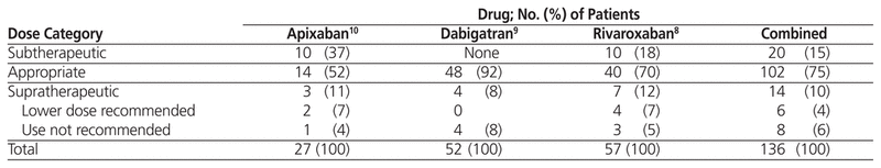 This study had several limitations. Given that it was a retrospective analysis and long-term follow-up data were not available, clinically important outcomes associated with the doses prescribed, such as thromboembolic or hemorrhagic events, could not be reported. Also, European guidelines provide dosing recommendations for apixaban and rivaroxaban in patients with CrCl as low as 15 mL/min, which may account for the use of these agents in some patients with renal insufficiency.22 Another limitation is that SCr values are affected by many factors and hence may be dynamic; values for this variable should be interpreted on the basis of trends rather than single measurements. The DOAC doses were assessed on the basis of a single SCr value, which may not be a true representation of a patient’s renal function. However, the last SCr reported in the chart is part of the final assessment of renal function before discharge and should be considered during prescribing. Weight is another dynamic variable that may not be frequently updated in the chart; weight variation could affect dosing recommendations.