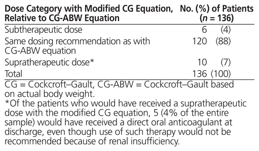 When determining an appropriate dosing regimen for the DOACs, accuracy in assessing renal function is imperative, because under- or over-dosing an anticoagulant has been shown to increase the risk of adverse outcomes secondary to thromboembolic or hemorrhagic complications, respectively.16 The purpose of this study was to determine whether the dose of apixaban, dabigatran, or rivaroxaban prescribed for elderly patients with atrial fibrillation was appropriate, based on estimation of renal function using the CG-ABW equation, and to assess the potential impact on dosing recommendations of using the modified CG equation.
