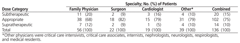 Patients receiving DOAC therapy were discharged from hospital by family practice physicians (n = 56 [41%]), surgeons (n = 22 [16%]), cardiologists (n = 19 [14%]), internists (n = 15 [11%]), medical residents/students (n = 8 [6%]), respirologists (n = 6 [4%]), nephrologists (n = 4 [3%]), neurologists (n = 3 [2%]), critical care intensivists (n = 2 [1%]), and a critical care associate (n = 1 [1%]). Statistical analyses were performed for the top 3 physician groups, with the remaining physicians categorized as “other”. There were no significant differences by physician specialty in appropriateness of dosing on the basis of the CG-ABW equation (p = 0.85). The percentage of physicians in each specialty who prescribed an appropriate discharge dose ranged from 68% to 82% (Table 4).