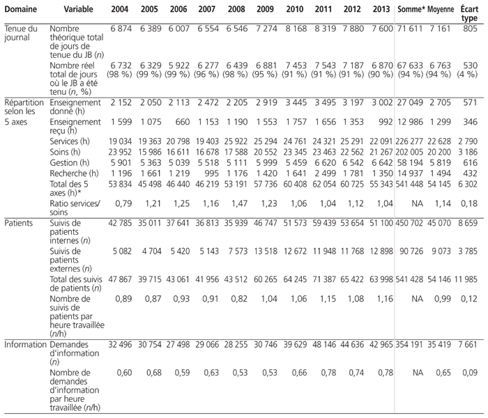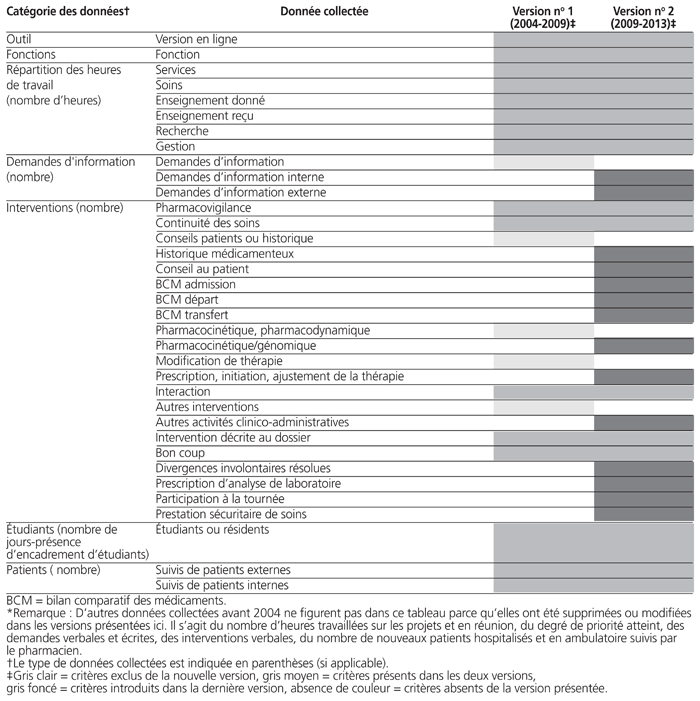 Le tableau 1 présente la comparaison des données collectées dans les différentes versions du journal de bord des pharmaciens de 2004 à 2013. Les changements apportés au contenu du journal de bord découlent de discussions entre les pharmaciens, de la volonté de refléter avec plus de justesse la charge de travail et de favoriser sa tenue au quotidien.