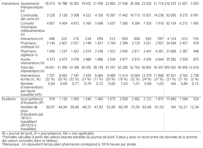 Le journal de bord a permis de calculer et d’analyser les variables suivantes : 1) nombre d’heures travaillées en temps pharmacien selon les cinq axes de pratique (gestion, services, soins, enseignement, recherche), 2) nombre de demandes d’information, 3) nombre d’interventions pharmaceutiques selon le type, 4) nombre de patients suivis en externe et en hospitalisation, 5) nombre de jours-présence d’étudiants de 1er ou de 2e cycle.