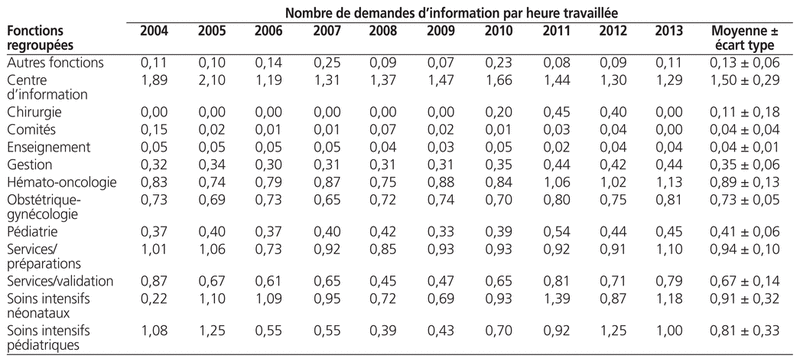Le tableau 4 présente le profil du nombre de demandes d’information par heure travaillée selon les fonctions types. Ce ratio est passé de 0,60 en 2004 à 0,78 en 2013. En 2013, ce ratio est plus élevé au centre d’information, en soins intensifs néonataux, en hémato-oncologie et aux services pharmaceutiques.