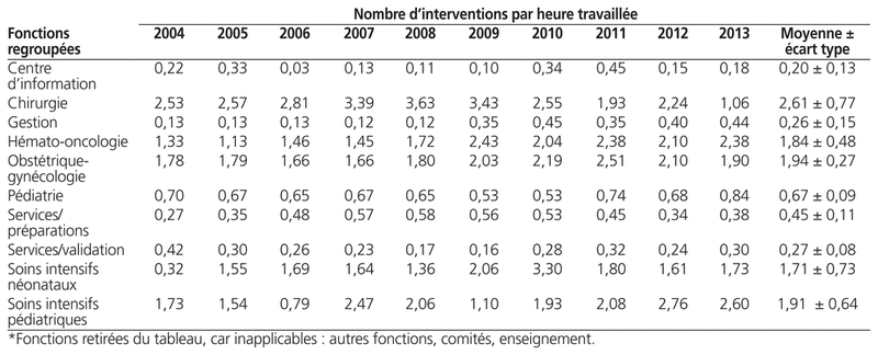 Le tableau 5 présente le profil du nombre d’interventions pharmaceutiques par heure travaillée selon les fonctions types. Ce ratio est passé de 0,64 en 2004 à 1,02 en 2013. En 2013, ce ratio est plus élevé en soins intensifs pédiatriques, en hémato-oncologie, en obstétrique-gynécologie et en soins intensifs néonataux.