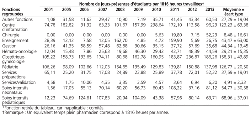 Enfin, le tableau 6 présente le profil du nombre de jours-présence d’étudiants par1816 heures travaillées selon les fonctions types. Le pharmacien employé à temps complet travaille 1816 heures par année. Ce ratio est passé de 30,97 en 2004 à 61,53 en 2013. En 2013, ce ratio est plus élevé en obstétrique-gynécologie, en pédiatrie et au centre d’information.