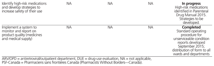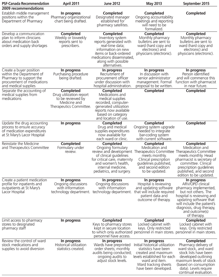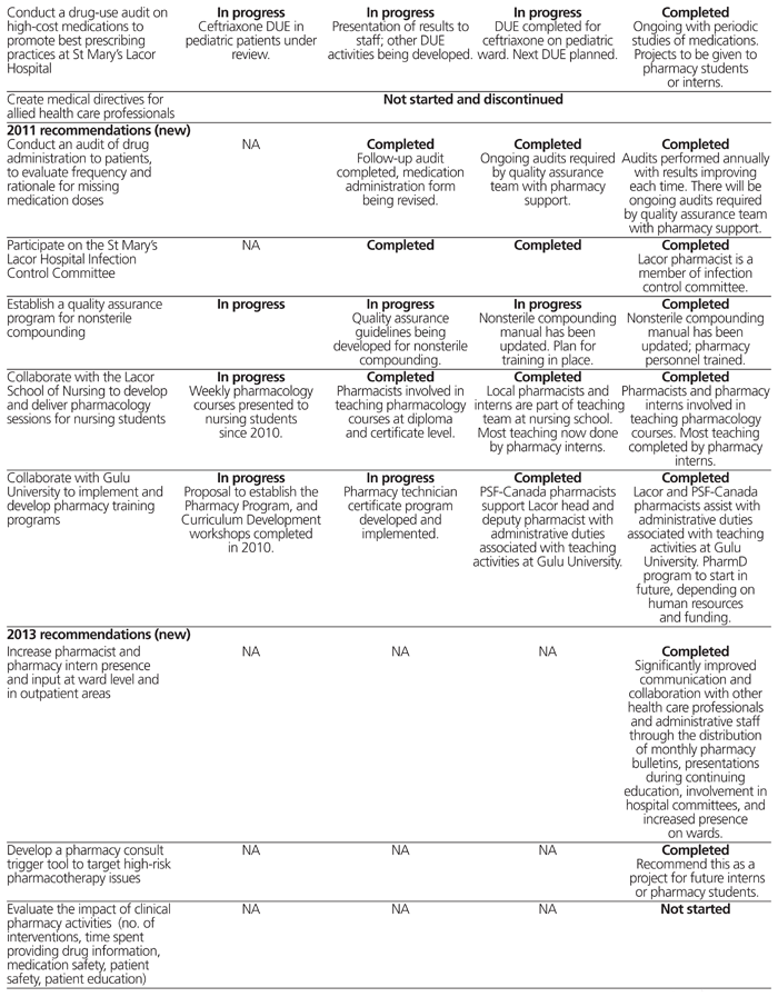 To track progress, and to ensure continuity and momentum, the annual mission assessments were conducted annually or biennially from 2010 to 2015. For these assessments, each of the 2008 Basel Statements was ranked as met, partially met, not met, or not applicable. In addition, each of the PSF-Canada recommendations was ranked according to level of completeness (not started, discontinued, in progress, or completed). After evaluation of each of the 2011 and 2013 assessments, 5 new recommendations were recognized and added to the PSF-Canada action plan, for a total of 10 new recommendations (Table 1). Each assessment was conducted by the PSF-Canada mission leader, the head pharmacist at Lacor Hospital, and the PSF-Canada on-site pharmacist. Each assessment included the following elements: