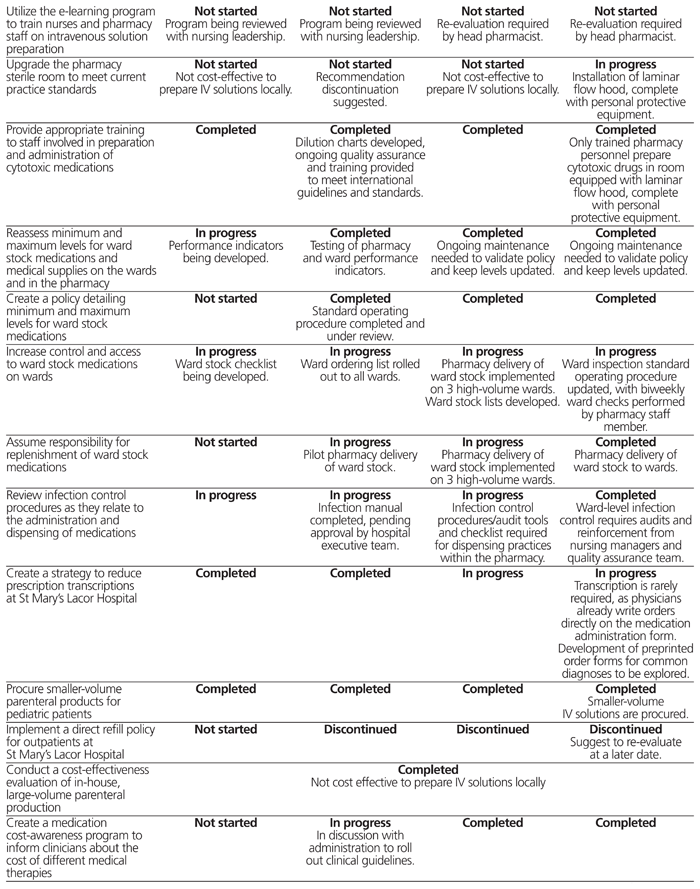 In 2009, 2 PSF-Canada pharmacist advisors (including R.V.) conducted an initial needs-based assessment. An original action plan was developed by PSF-Canada, in conjunction with the Lacor Hospital executive and pharmacy managers, consisting of 24 recommendations (Table 1). The aim of the action plan was to address and close the gaps between current and desired hospital pharmacy practice as envisioned by the 2008 Basel Statements (Table 2).