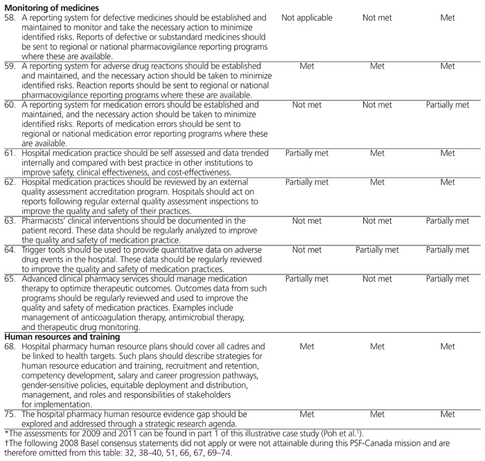 This illustrative case study had 3 limitations. First, we were unable to assess the Lacor Hospital’s progress in relation to 13 of the Basel Statements (see Table 2). Eight of these 13 statements ranked as “not applicable” fall within the same theme, human resources and training. To achieve these criteria, a national-level assessment involving multiple stakeholders would be required, but such an assessment was not realistic for Lacor Hospital, nor was it within the scope of the PSF-Canada mission. The other 5 “not applicable” statements were related to areas that did not exist in or were not feasible for Lacor Hospital at the time, including enhanced pharmacy technology (e.g., unit-dose distribution systems) and investigational medications for research purposes. Second, use of the terms “partially met” and “in progress” to rank the status of the 2008 Basel Statements and the PSF-Canada recommendations, respectively, allowed inter-rater variability and subjectivity. In this case study, the assessors were the PSF-Canada mission leader and the on-site PSF-Canada pharmacist. The individuals holding these positions changed over time, which left room for different interpretations of the terminology at the time of assessment. Finally, the on-site PSF-Canada pharmacists were responsible for both the interventions to meet the prescribed goals and assessments of the outcome of these interventions, a situation that may introduce bias. Given the limited resources available for this PSF-Canada mission, seeking assessments from external or independent reviewers was not feasible. To overcome the potential bias, validation of the assessments was completed by many other key individuals, including past PSF-Canada pharmacists and St Mary’s Lacor Hospital staff members, such as the executive director, institutional director, medical director, senior administrators, matron, assistant matron, and internal auditors.