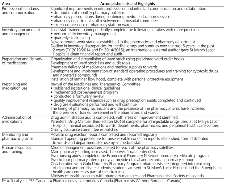 The majority of the interventions undertaken to achieve the PSF-Canada recommendations, described briefly in Table 1, were implemented within the hospital’s Department of Pharmacy. The implementation strategies to achieve each goal were at the discretion of the on-site PSF-Canada pharmacist, in conjunction with the PSF-Canada mission leader and the Lacor Hospital pharmacy team. Because of the advancement of the hospital’s Department of Pharmacy, it became a location for both Canadian and Ugandan pharmacy students to complete rotations for their professional programs. The students completed projects that supported the Department of Pharmacy in achieving the PSF-Canada recommendations. Examples of student projects included updating the Parenteral Drug Manual, completing drug-use evaluations, completing clinical intervention investigations, and developing standard operating procedures used to train staff in handling cytotoxic drugs. In 2011, a pharmacy certification program was instituted under the auspices of the Gulu University Faculty of Medicine. Through this accomplishment, Lacor Hospital became one of the training centres for the pharmacy technician certification and diploma programs. Details of these accomplishments are presented under “human resources and training” in Table 3.