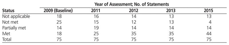 A quantitative analysis of progress in relation to the 2008 Basel Statements at Lacor Hospital is summarized in Table 4. From 2009 to 2015, the number of fully achieved (status of “met”) statements climbed from 18 (24%) to 44 (59%). In addition, 14 statements achieved the status of “partially met”, increasing the success of the mission. The number of “not applicable” statements was reduced from 18 (24%) in 2009 to 13 (17%) in 2015. Seven of the 13 statements ranked “not applicable” revolved around human resources and training and thus required national-level collaboration. That level of collaboration was beyond reach for the hospital and for this particular PSF-Canada mission.