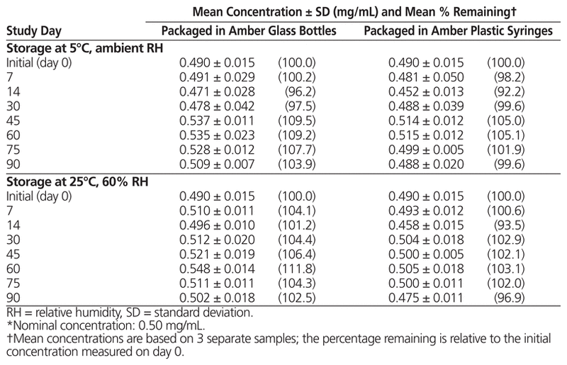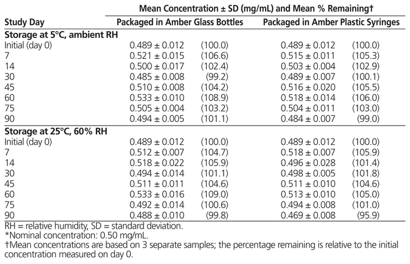 Each preparation was packaged in amber glass bottles (6 × 30-mL fill volume; 50-mL Wheaton type 1 bottles, Medisca Pharmaceutique Inc, lot 24908/A) and amber plastic syringes (48 × 1-mL fill volume; PreciseDose Dispenser, lot 46968/C, with tip cap, lot 55052/A, Medisca Pharmaceutique Inc). Preparations were stored at 5°C or 25°C for up to 90 days. Three bottles were stored at each temperature, and an aliquot was removed from each bottle at each time point for analysis. Half of the syringes were stored at each temperature, and 3 syringes per temperature were used for analysis on each study day.