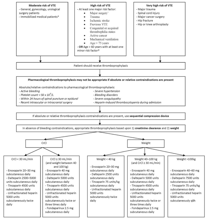 Figure 1 Algorithm for prophylaxis for venous thromboembolism according to patient risk factors. *”Immobility” was defined as the patient being able to get up to go to the bathroom, but lacking mobility for any other reason. †Minor risk factors were severe respiratory disease, active congestive heart failure, immobility for more than 72 h, collagen vascular disease, obesity, active inflammatory bowel disease, sepsis, nephritic syndrome, estrogen therapy, pregnancy or up to 6 weeks postpartum. |