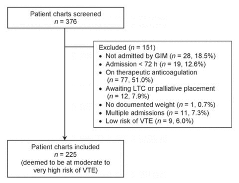 Figure 2 Patient flow through the study. Of the 151 charts excluded, 6 had more than one reason for exclusion. GIM = general internal medicine, LTC = long-term care, VTE = venous thromboembolism. |