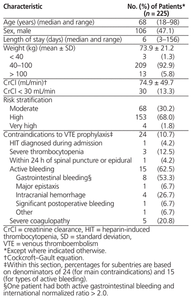 Secondarily, the proportion of patients receiving appropriate VTE prophylaxis in this study was compared with that of local provincial audits, using data from the same medicine units over the same time interval. In addition, the frequency of patients not receiving appropriate VTE prophylaxis and the basis for deeming prophylaxis to be inappropriate (e.g., incorrect drug, dose, frequency, or duration) were reported. The proportion of at-risk patients who experienced a thrombotic or major bleeding event, regardless of the appropriateness of VTE prophylaxis (i.e., with either appropriate or inappropriate VTE prophylaxis), was also reported. For the duration of the patient’s hospital stay, thrombotic events were defined on the basis of per-chart documentation (encompassing deep vein thrombosis, pulmonary embolism, or thromboembolism to another site, which may have included myocardial infarction, stroke, or portal vein thrombosis), whereas major bleeding was defined as fatal bleeding, symptomatic bleeding in a critical area or organ, bleeding causing a decrease in hemoglobin greater than or equal to 20 g/L, and/or transfusion of 2 or more units of whole blood or red blood cells.17