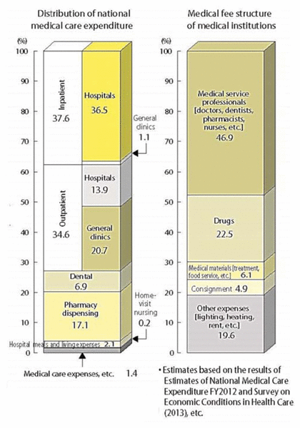 In fiscal year 2012, pharmacy dispensing accounted for 17.1% of Japan’s health expenditures, and drugs accounted for 22.5% of costs in medical institutions (Figure 2).3