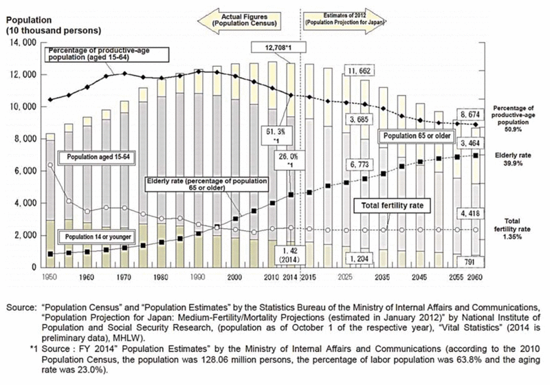Figure 3 Population trends in Japan. Reproduced from Annual Health, Labour and Welfare Report 20154 (Japanese Ministry of Health, Labour and Welfare). |