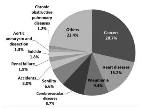 Figure 4 Major leading causes of death in Japan in 2015. Reproduced from “Percentage distribution of causes of death in Japan”13 (Japanese Ministry of Health, Labour and Welfare). |