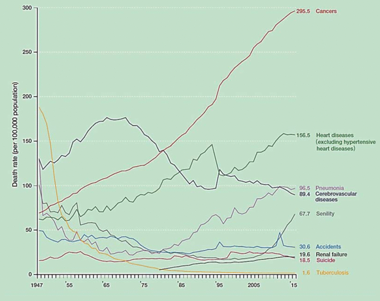 Figure 5 Trends in death rates for leading causes of death, from 1947 to 2015. Reproduced from “Vital Statistics”10 (Japanese Ministry of Health, Labour and Welfare). |