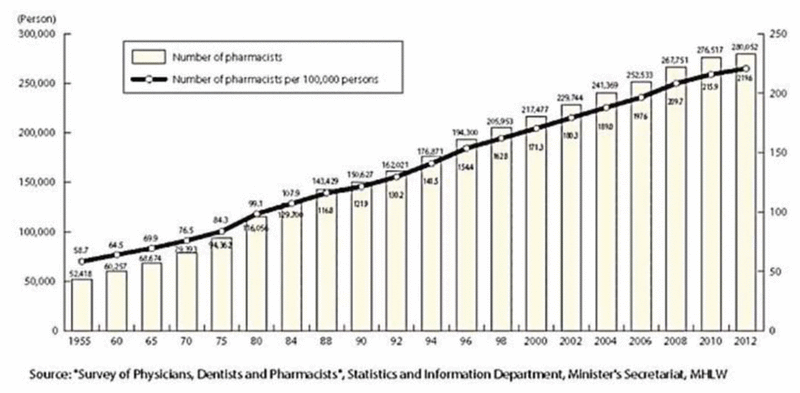 Figure 6 Changes in numbers of pharmacists over time. Reproduced from Annual Health, Labour and Welfare Report 20153 (Japanese Ministry of Health, Labour and Welfare). |