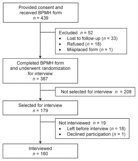 A total of 439 patients provided consent, of whom 52 were excluded for various reasons and 387 completed some or all of the BPMH form (Figure 1). These 387 patients underwent randomization, and 179 were selected for an interview. Of these 179 patients, 1 patient declined to take part in the interview because of illness, and 18 patients left the emergency department or were discharged before the interview could take place. The remaining 160 patients were interviewed, and their characteristics are presented in Table 1.