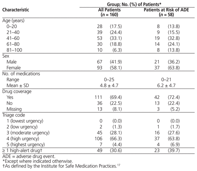 After the interviews and data collection were completed, patients considered to be at risk for adverse drug events were identified from among the interviewed patients using criteria modified from those of Hohl and others9 (i.e., 1 or more classes of a medication or antibiotic used within the past 7 days plus age > 80 years or a medication start or stop within the past month).
