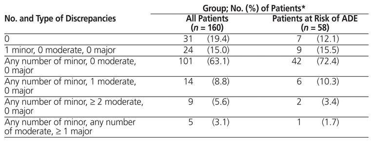 Of the 160 interviewed patients, 58 (36.3%) were classified as being at risk for adverse drug events, according to the modified criteria. Of this at-risk population, 55 patients (94.8%) completed the form with no more than 1 moderate discrepancy (plus any number of minor discrepancies). Seven (12.1%) of the patients had no discrepancies, 42 (72.4%) had only minor discrepancies, and 6 (10.3%) had 1 moderate discrepancy (Table 2).