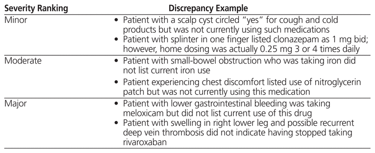 This study had a number of limitations. It may have been subject to additional selection bias because the number of patients who initially refused to complete the BPMH form could not be determined. The study was conducted with a convenience sample on weekdays (Monday to Friday) from 0730 to 1530; therefore, it is unclear whether the results would be applicable to patients coming to the emergency department on other days or at other times or to patients seen in other settings. The definitions for severity and type of discrepancy have not been validated in an outpatient population.18–22 Several questions on the BPMH form had relatively low response rates, which may indicate a need for further clarification within the form. A possible improvement might be to add a yes/no selection option for questions about recently starting or stopping medications, and for the question inquiring about tobacco, alcohol, and recreational drug use. The questions on the second page of the BPMH form had lower completion rates, which indicates that the form may have been too long to hold the attention of some patients. Health care professionals with emergency department experience, such as the panel members who categorized the type and severity of medication discrepancies, may assign lower severity ratings (relative to health care professionals without emergency experience), because they are used to making decisions on the basis of limited information; this may have represented an additional source of bias. Another potential limitation is that the discrepancy panel interpreted “yes” responses for medications that were not currently being used as “commission” discrepancies, which may have elevated the count of commission discrepancies above what would have been obtained otherwise. Finally, the severity of each discrepancy was assessed separately, not in combination with all identified discrepancies for that patient. Multiple minor discrepancies in the same patient could increase the potential for a more severe adverse event than what the panel selected.