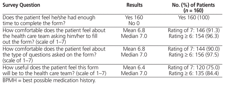 The patient survey indicated high levels of satisfaction with the BPMH form. Most patients indicated a high level of comfort with the form and its perceived value to the health care team. Only patients who consented to participate in the study were surveyed, which may have resulted in selection bias.