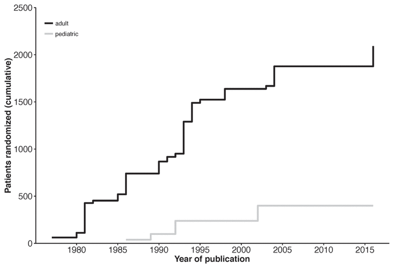 Stress ulcer prophylaxis was a success story in critical care research in the 1980s and 1990s, and became one of the few interventions supported by numerous randomized controlled trials (RCTs). However, many of these trials were small, and all were at high risk of bias. In the 20 published trials involving adults (with randomization of 1971 patients), stress ulcer prophylaxis was associated with reduced gastrointestinal bleeding (relative risk [RR] 0.4, 95% confidence interval [CI] 0.3–0.7) but not reduced mortality (RR 1.0, 95% CI 0.8–1.2).8 The data for children are even sparser. In 3 trials (with randomization of 340 children), prophylaxis was not associated with a reduction in bleeding (RR 0.7, 95% CI 0.4–1.2).9 Despite no clear effect on mortality or even clinically important bleeding, stress ulcer prophylaxis was incorporated into guidelines and has been widely adopted as a standard practice, based on the association of gastrointestinal bleeding with ICU length of stay and mortality, combined with the perceived benign nature of the intervention. After the initial enthusiasm, though, the research focus shifted to comparing agents, and no RCTs comparing stress ulcer prophylaxis with placebo were published between 2004 and 2016 (Figure 1).