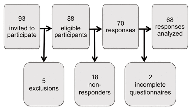 Ninety-three pharmacists were identified during the recruitment phase, and the link to the survey questionnaire was sent to these pharmacists by e-mail. According to their responses to the initial participant screening questions, 5 of these pharmacists were excluded, because they had not formally started their positions or no longer worked at a tertiary care academic hospital, which left 88 eligible pharmacists (Figure 1).