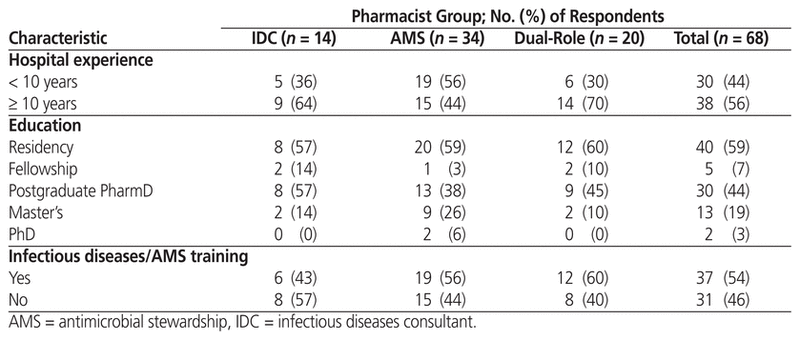 The 88 eligible pharmacists were practising across Canada: 8 (9%) in Alberta, 13 (15%) in British Columbia, 3 (3%) in Manitoba, 3 (3%) in New Brunswick, 2 (2%) in Newfoundland and Labrador, 1 (1%) in Nova Scotia, 44 (50%) in Ontario, 12 (14%) in Quebec, and 2 (2%) in Saskatchewan. Of the 88 eligible participants, 70 provided responses; however, 2 of the returned questionnaires were incomplete (with at least 1 question left unanswered). Therefore, 68 completed questionnaires were analyzed, representing a response rate of 77% (68/88). Of the 68 respondents, 14 (21%) self-identified as IDC pharmacists, 34 (50%) as AMS pharmacists, and 20 (29%) as dual-role IDC and AMS pharmacists. Forty-three pharmacists reported the presence of both IDC and AMS pharmacists at their institutions, and 20 (47%) of these 43 indicated that different individuals (i.e., more than one person) filled these particular roles.