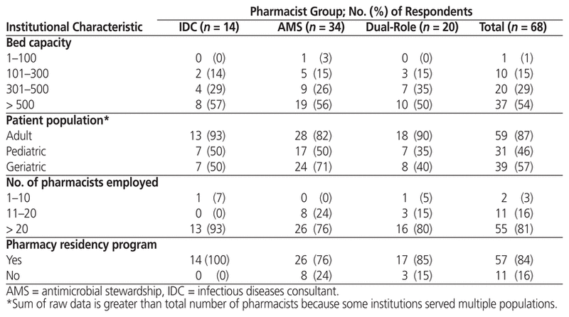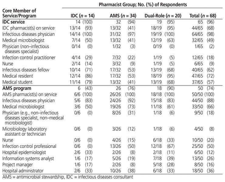 Institutional characteristics and features of the IDC services and AMS programs are described in Table 2 and Table 3, respectively. Eight (57%) of the 14 IDC pharmacists, 19 (56%) of the 34 AMS pharmacists, and 10 (50%) of the 20 dual-role pharmacists reported working in an institution with more than 500 beds. Respondents were predominantly employed by institutions serving adults, as indicated by 13 (93%) of the 14 IDC pharmacists, 28 (82%) of the 34 AMS pharmacists, and 18 (90%) of the 20 dual-role pharmacists. Overall, 65 (96%) of the 68 respondents reported the presence of an IDC service at their institutions, and 50 (74%) reported the presence of a funded AMS program. Of the 65 institutions with an IDC service, 44 (68%) had an IDC pharmacist on the team, and all 50 (100%) of the 50 institutions with an AMS program had an AMS pharmacist on the team.