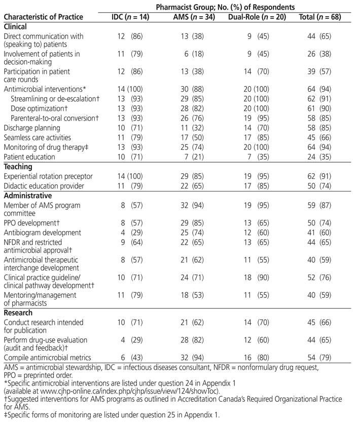 The survey response rate was 77% (68/88). The 68 respondents self-identified as IDC pharmacists (14 [21%]), AMS pharmacists (34 [50%]), or dual-role IDC and AMS pharmacists (20 [29%]). Compared with AMS pharmacists, IDC pharmacists reported more of the following unique clinical activities: directly communicating with patients, attending rounds, involving patients in decision-making, and providing patient education. The 3 groups of pharmacists described similar educational responsibilities. The AMS pharmacists performed more of the following administrative and research duties: development of antibiograms and preprinted orders, collection of antimicrobial metrics, and drug-use evaluations for antimicrobials. Dual-role IDC and AMS pharmacists were involved in fewer of the unique activities described by those who practised within a single subspecialty.