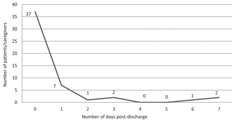 Among the 50 participants who were discharged home and who had subsequent contact with the community pharmacy, most patients and/or their caregivers (37 or 74%) presented to the community pharmacy on the day of discharge. However, in 2 cases, a week elapsed before the patients had any contact with their respective pharmacies (Figure 2). All of the community care and long-term care facilities to which study participants were transferred (n = 18 patients) contacted a community pharmacy on the day of discharge; however, these contacts were not considered to represent “presentation” at the pharmacy.