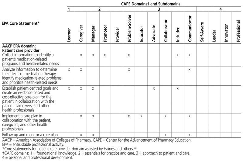 21 Pittenger AL, Chapman SA, Frail CK, Moon JY, Undeberg MR, Orzoff JH. Entrustable professional activities for pharmacy practice. Am J Pharm Educ. 2016;80(4): Article 57.