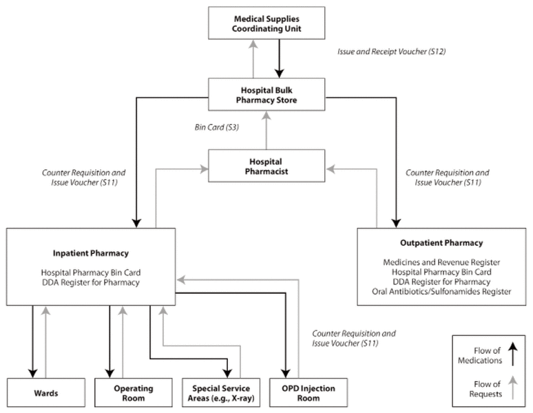 In large hospitals, whether private or public, inpatient dispensing is done from satellite pharmacies throughout the hospital, with outpatient services provided from a separate section. Small hospitals typically have one pharmacy from which all medication is dispensed. Figure 1 shows how medicines are distributed in Kenyan public hospitals.25