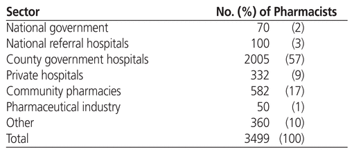 In summary, most pharmacists are employed in county hospitals, which are run by the county governments. The community pharmacy sector has relatively few pharmacists because it is more product-oriented. Currently, there is a drive to boost pharmacists’ interest in community pharmacy practice by introducing medication therapy management services into this setting.