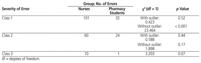 Numbers of errors were compared between nursing staff and pharmacy students using a Q–Q plot, which indicated χ2 distribution of the data. The Kruskal–Wallis test based on pooled variance was used to determine whether types of errors were significantly different. An α value of 0.05 was used for all analyses.