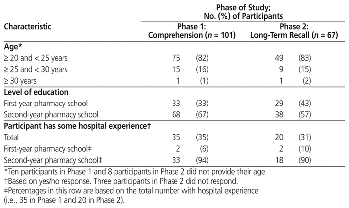 In Phase 1 of the study, 101 students participated. In Phase 2 of the study, 67 students completed the recall assessment. Demographic information for these participants is presented in Table 1.
