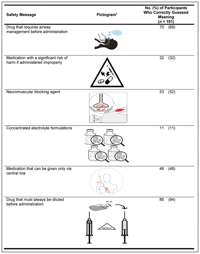Implementation of medication safety programs has the potential to save health care systems substantial costs and to prevent serious patient injury, thereby leading to better patient outcomes.29 In this study, we assessed the comprehensibility of 9 pictograms developed to increase medication safety through interception and prevention of medication administration errors. Further studies will be needed to validate the pictograms in a sample of health care professionals and possibly to redesign and validate the pictograms depicting “Concentrated electrolyte formulations” and “Medication with a significant risk of harm if administered improperly”. It will be important to determine how these pictograms can be simplified or how the messages themselves could be clarified to represent the same ideas. Future studies will focus on the impact of the 9 pictograms in preventing medication administration errors in a health care setting and in improving clinical outcomes.