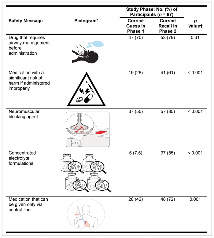 A total of 67 participants from the first phase of the study completed the second phase. For each pictogram, comprehension and recall rates for participants who completed both Phases 1 and 2 are presented in Table 3. At recall, 7 of the 9 pictograms reached the ISO standard of at least 67% comprehension, with only “Concentrated electrolyte formulations” (37/67 [55%]) and “Medication with a significant risk of harm if administered improperly” (41/67 [61%]) not reaching the minimum threshold for comprehension. All but 2 of the pictograms were understood by more participants during Phase 2 than Phase 1. The 2 pictograms without a statistically significant increase in understanding were “Drug that requires airway management before administration” (47/67 [70%] in Phase 1 versus 53/67 [79%] in Phase 2; p = 0.31) and “Medication that has a high incidence of calculation/dosage errors” (61/67 [91%] in Phase 1 versus 66/67 [99%] in Phase 2; p = 0.06 by Fisher exact test). In both cases, the pictograms were relatively well understood in Phase 1, leaving less room for improvement in comprehension after training.