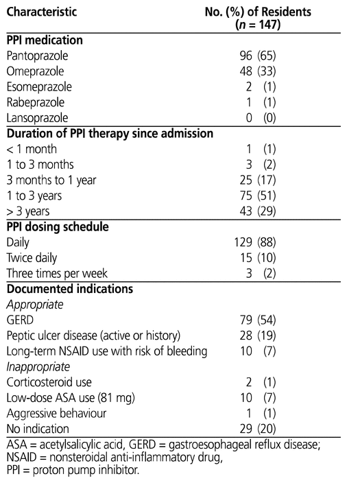 Inappropriate documented indications in this chart review included concurrent use of low-dose ASA or a corticosteroid. There is unconvincing evidence that either of these medications require concomitant PPI therapy in the absence of other risk factors for gastrointestinal toxicity.30 The chart review also identified a single resident for whom the documented indication for PPI use was aggressive behaviour. The authors are unaware of any literature to support this indication.