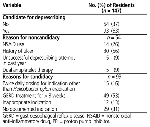 Three of the selected charts were excluded because of missing information. Of the 147 residents included in the chart review, 93 (63%) were candidates for deprescribing. PPI use for gastroesophageal reflux disease for more than 8 weeks without a deprescribing attempt in the past year was the most frequently observed opportunity for deprescribing (49/93 [53%]). Twenty-nine residents (20%) had no documented indication for PPI use. Thirteen residents (9%) had had a fall within the past 30 days, and 53 (36%) had a prescription for vitamin B12 supplements and/or had low serum vitamin B12 levels.