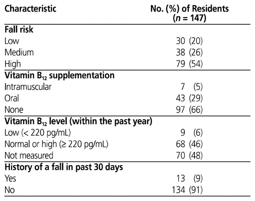 More than half of the study population was considered to be at high risk for falls (Table 4). For 70 residents (48%), vitamin B12 had not been measured in the past year (Table 4). Fifty-three residents (36%) were receiving oral or intramuscular vitamin B12 supplementation and/or had low serum vitamin B12 levels.